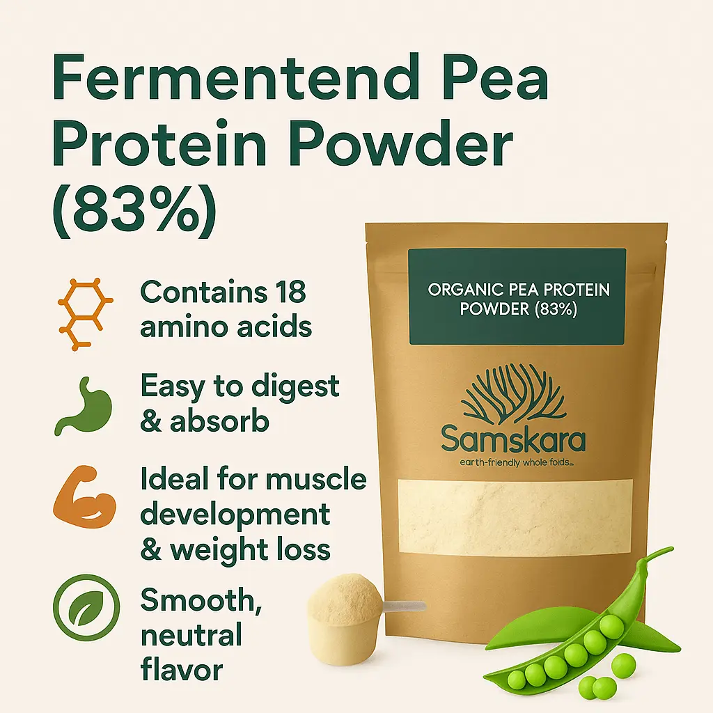 Samskara Fermented Pea Protein offers 24g of plant-based protein per 30g serving. Rich in amino acids, neutral in taste, and easy to digest. Ideal for fat loss and muscle gain