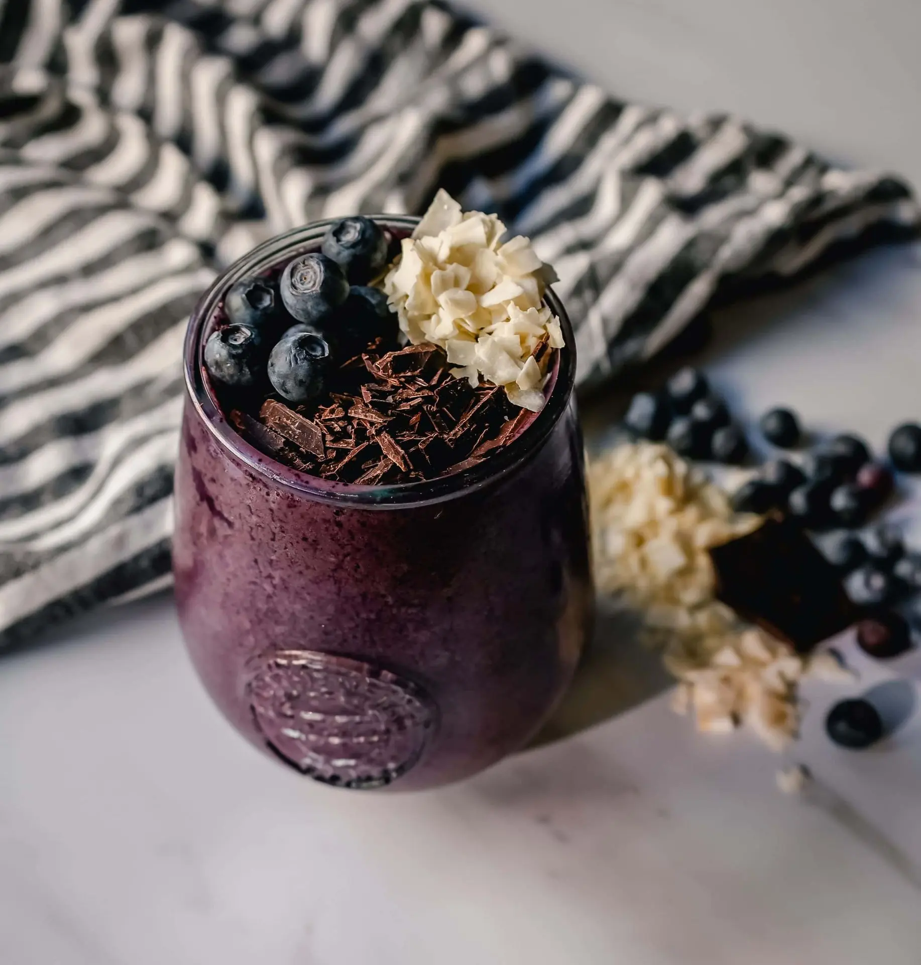Rich antioxidant properties made with frozen blueberries powder, coconut milk, chocolate protein powder, almond butter, cacao powder, banana, and topped with coconut flakes.